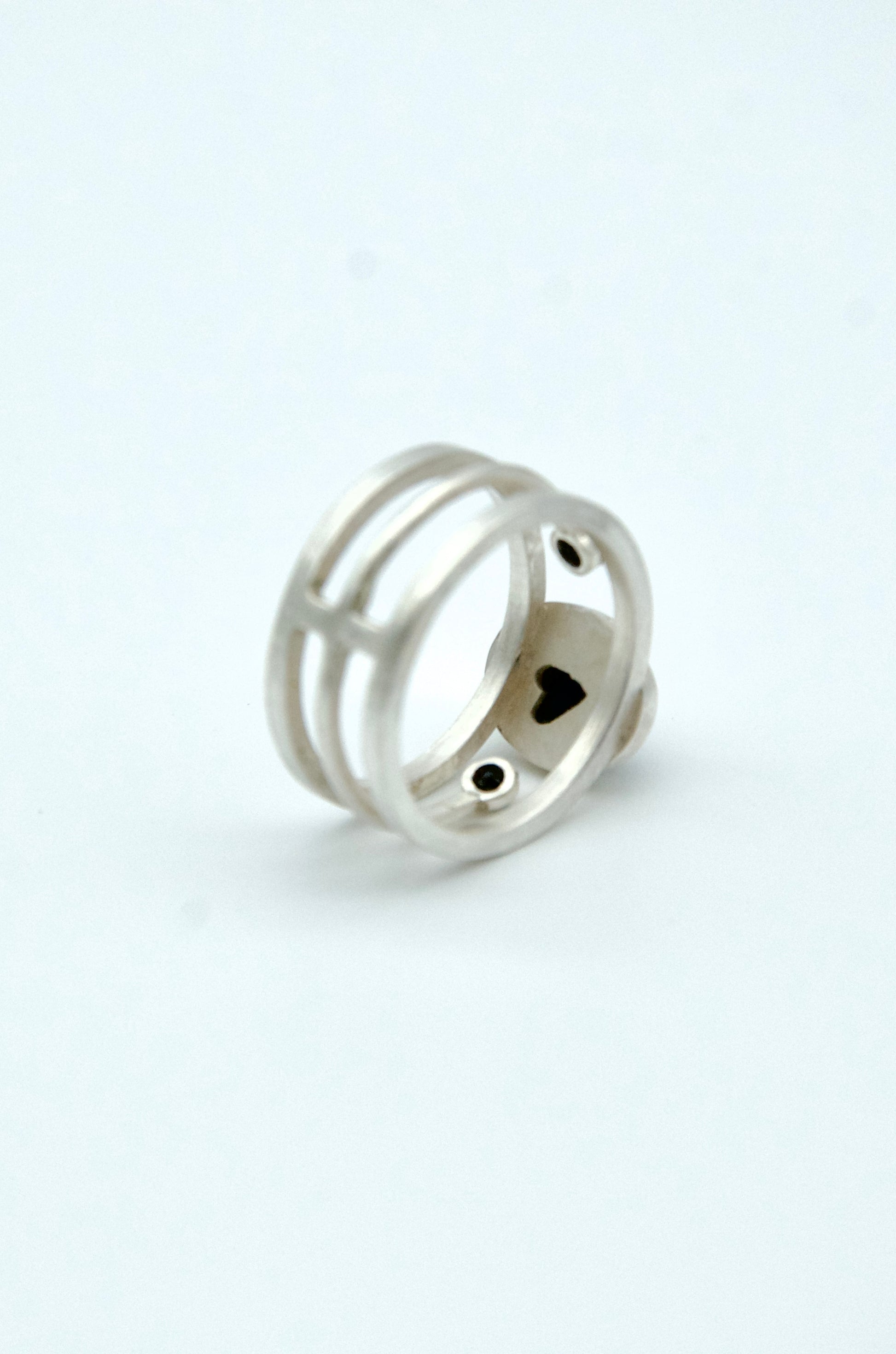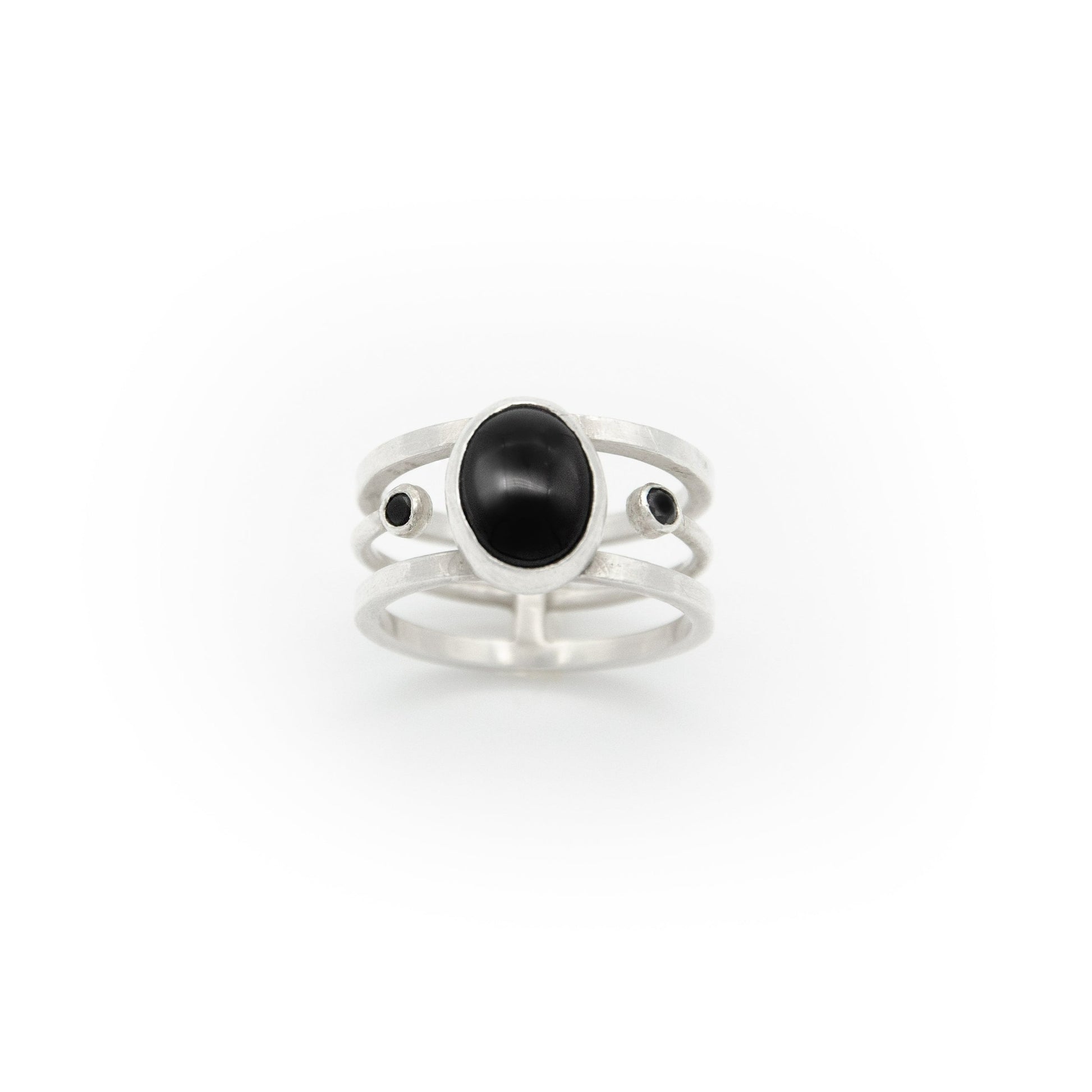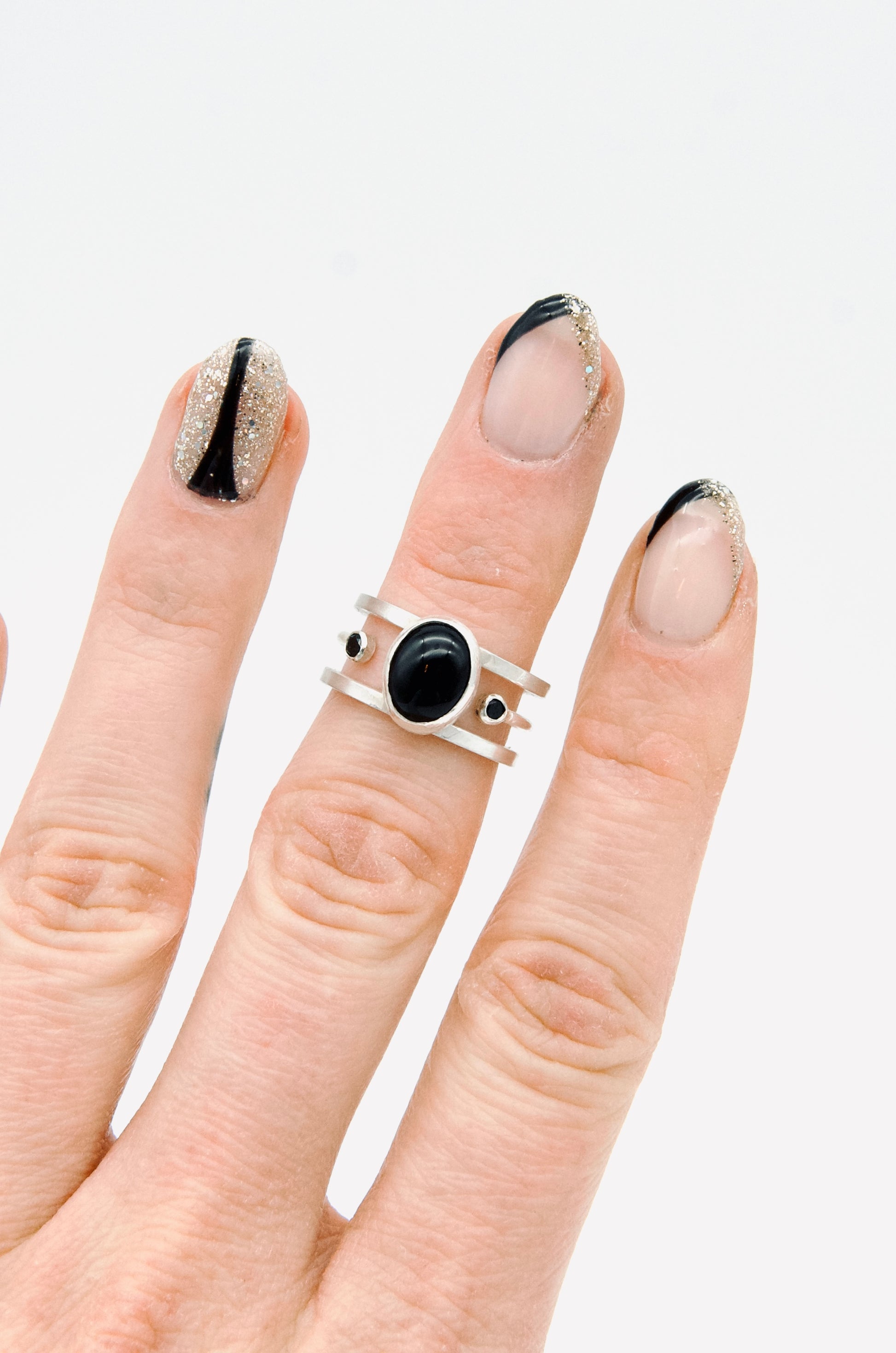 Have you always wanted a stack collection but all in one? Well you've found it! The interconnected ring, complemented with a Onyx cabochon and floating black Spinels, gives the appearance of a stack - without all the slipping and sliding.